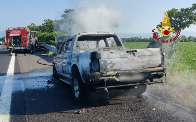 Accosta per controllare l’auto, ma quando scende il pick up prende subito fuoco