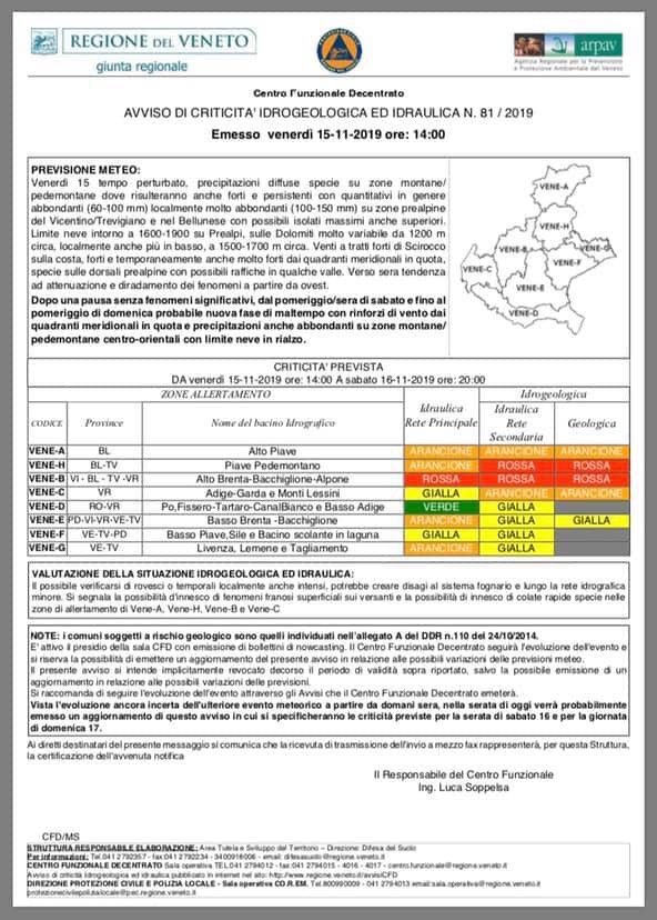 Per il bacino dell’Alto Brenta l’allerta è passata al livello rosso per quanto riguarda la rete idraulica principale. Rimane rosso anche per la rete idraulica secondaria e sul fronte idrogeologico.