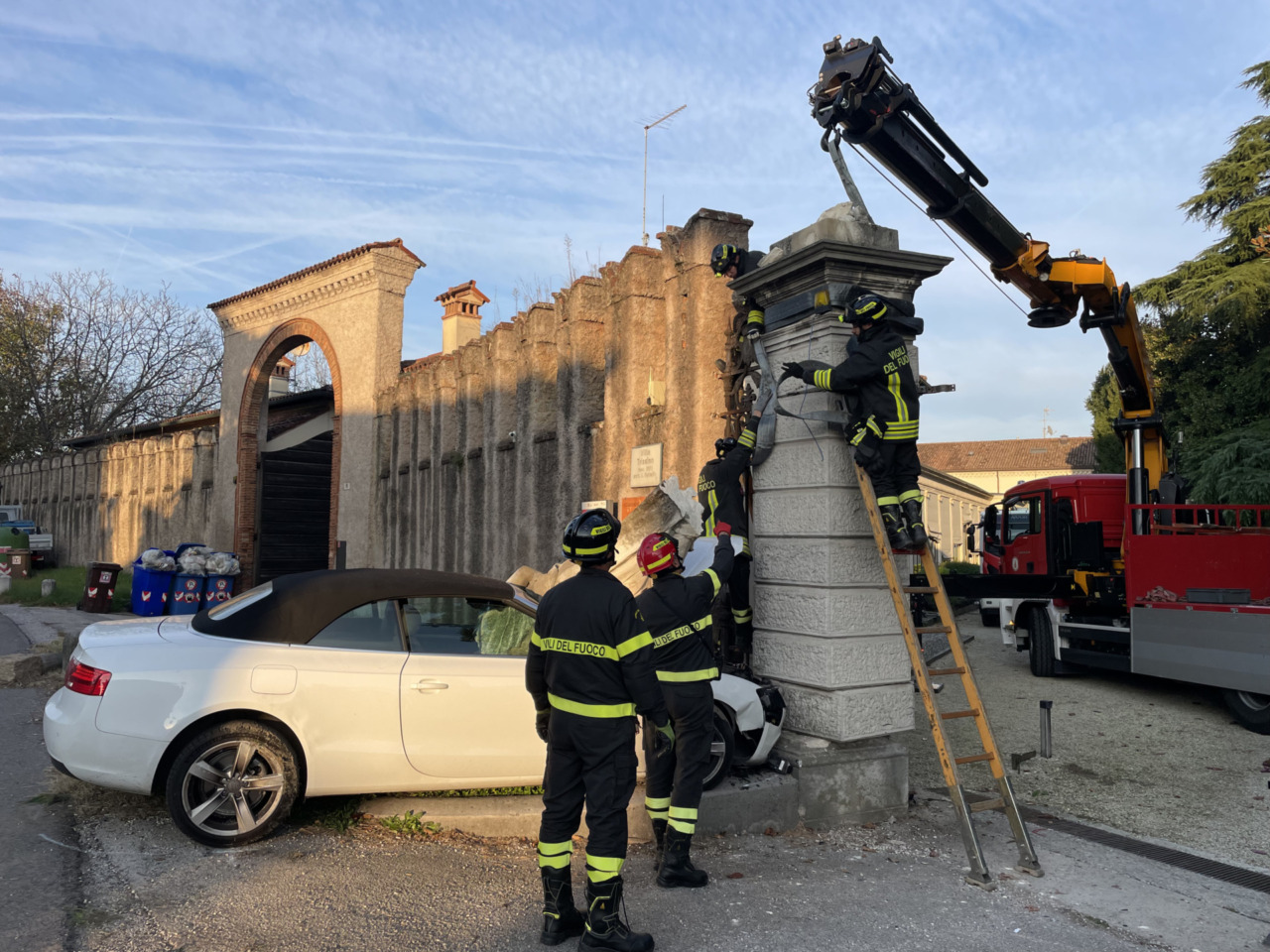 Audi A5 contro il cancello di Villa Trissino a Vicenza: crolla una statua che sfonda il parabrezza