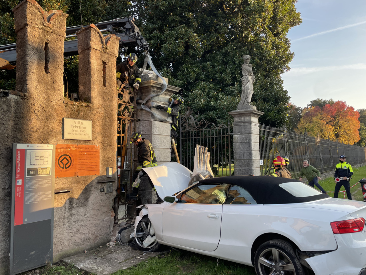Non sono ancora chiare le dinamiche che hanno portato un Audi A5 a schiantarsi contro una delle colonne d’ingresso ai giardini di Villa Trissino, che si affaccia sulla strada provinciale Marosticana.