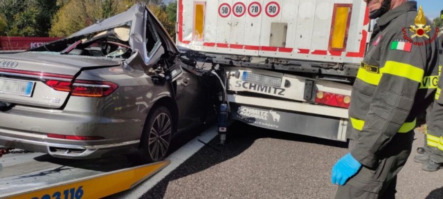 Audi finisce sotto a un camion sull’A4, a causa della coda si scontrano anche due furgoni a 2 km di distanza