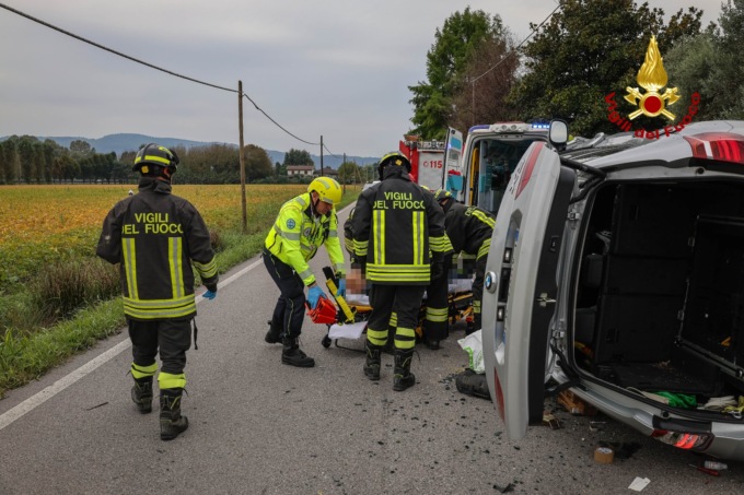 Incidente stradale a Torri di Quartesolo nella giornata di lunedì 7 ottobre 2024: autovettura Bmw X3 si ribalta su un lato e colpisce un contatore del gas: ferita una coppia di padovani.
