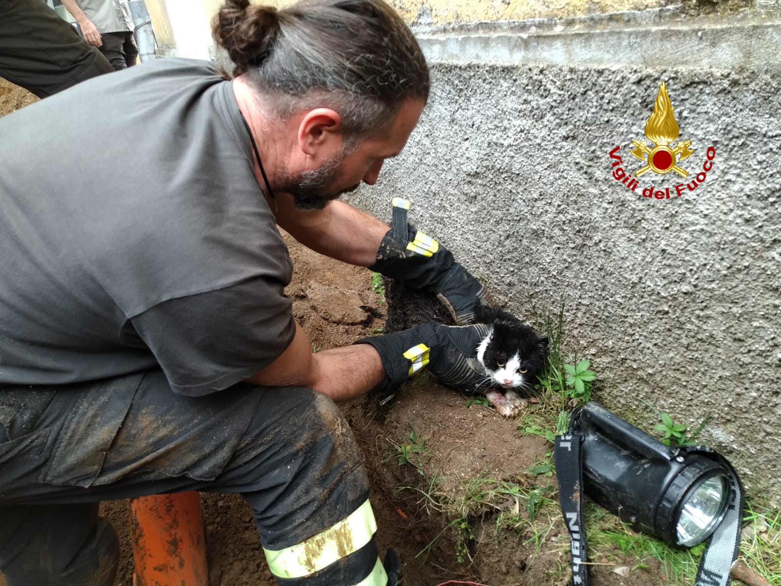 All’arrivo della squadra si sentiva il solo miagolio, senza poter stabilire la posizione dell’animale. Dopo essere stato individuato grazie a una telecamera ed all’aiuto di alcuni privati, con un piccolo scavatore si è scavato fino al tubo, interrato per circa 80 cm, che è stato tagliato per recuperare il micio.