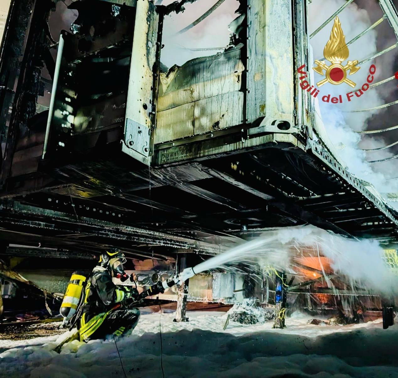 I Vigili del fuoco del distaccamento di Bassano del Grappa, coadiuvati dai colleghi della centrale di Vicenza e di Padova, sono intervenuti con 5 automezzi e 14 operatori per estinguere l’incendio che ha coinvolto una decina di semirimorchi parcheggiati alla Marchiori Trasporti, oggi Visonà Spedizioni.
