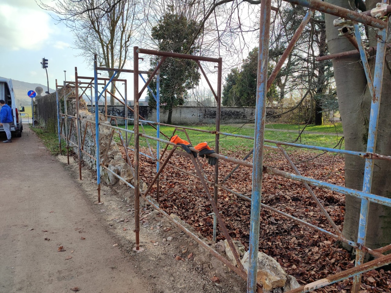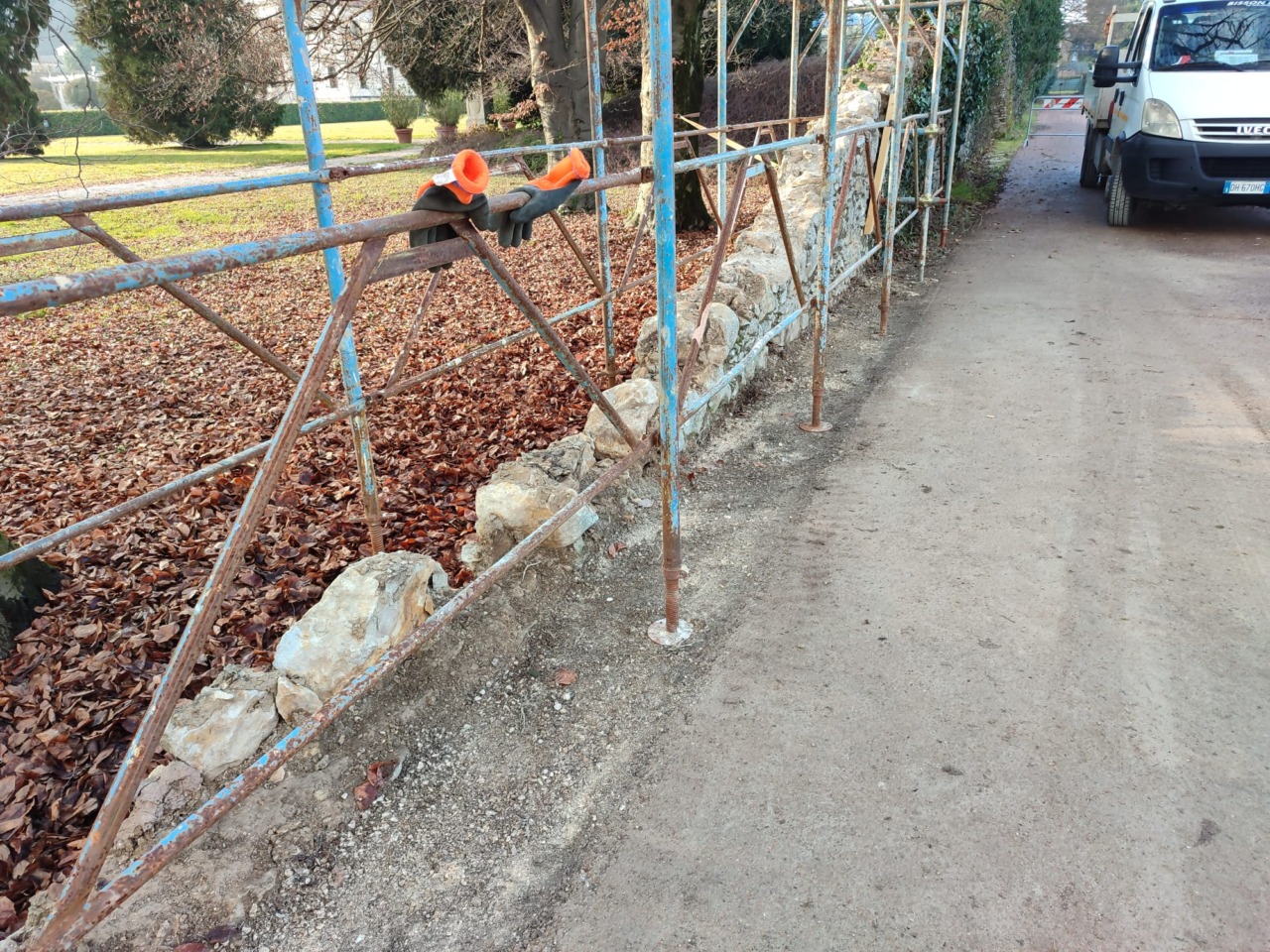 È in corso la chiusura del varco con rete di protezione e teli specifici. L’intero tratto di muro ritenuto instabile è stato transennato, creando un perimetro di sicurezza invalicabile.