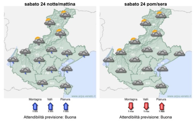 - Precipitazioni. Nella notte fino al mattino precipitazioni sparse, a tratti diffuse, poi in diradamento ed esaurimento nel corso del pomeriggio fino a risultare assenti. Quota neve fino a fondovalle sui settori dolomitici e prealpini.