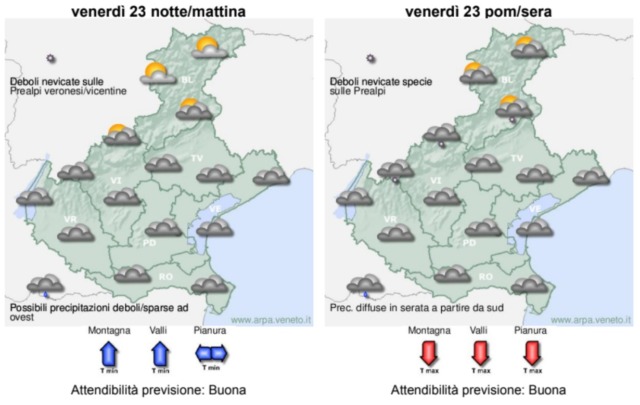 - Precipitazioni. Da metà mattina e fino a buona parte del pomeriggio, sarà probabile qualche sporadica precipitazione sparsa e discontinua; in seguito le precipitazioni tenderanno a divenire diffuse, a partire da sud/sud-ovest, salvo su Dolomiti e pianura nord-orientale dove saranno ancora deboli e sporadiche. Il limite della neve sarà fino a fondovalle sui settori dolomitici e prealpini, altrove fino a quote collinari (500-700 m), non si esclude ad inizio evento qualche fiocco sull’alta pianura/Pedemontana.