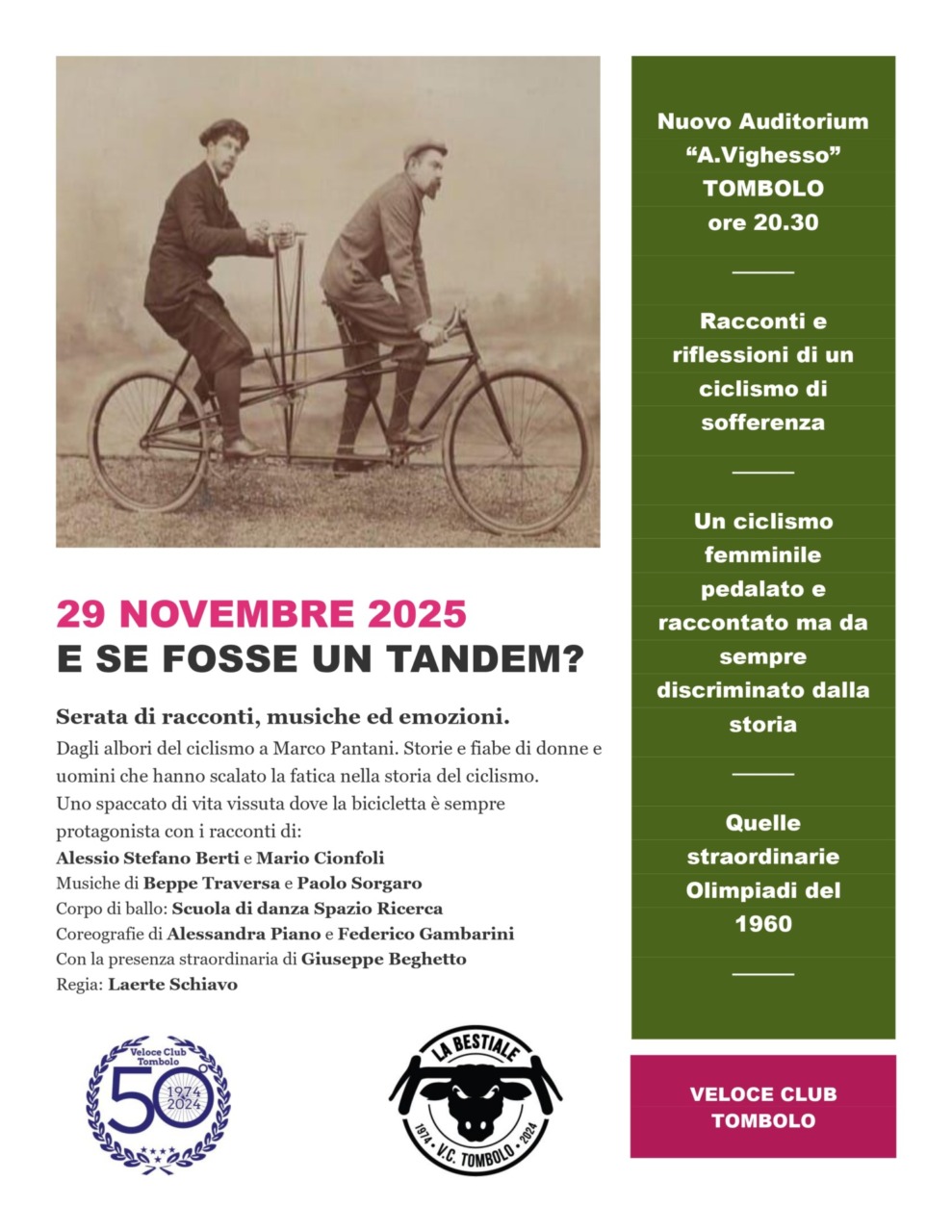 Sabato 29 novembre 2025, vigilia de “La bestiale”, dalle 20:30, con ingresso gratuito all’Auditorium “Alberto Vighesso” di Tombolo, andrà in scena uno spettacolo che proporrà la pratica della disciplina ciclistica dai suoi albori, fino a Marco Pantani, con un serie di fiabe, storie di uomini e donne che hanno scalato la fatica nella storia del ciclismo.