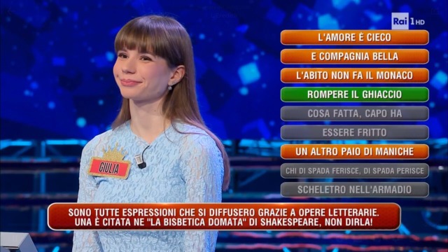 Dice Giulia. Nel gioco dopo sceglie la materia “Lingue d’Italia”, domanda a cui nessuno dei presenti ha saputo identificare il significato del termine napoletano “paraustiello”, lasciando i budget invariati.