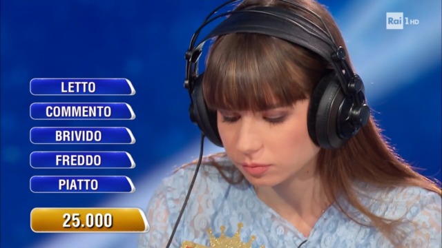 Purtroppo per lei, la cifra ha continuato a dimezzarsi, raggiungendo i 25mila euro quando dove scegliere la parola esatta. Gli indizi erano: letto, commento, brivido, freddo, piatto.