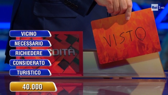 Come da regolamento, la campionessa ha avuto sessanta secondi per riflettere e trovare la soluzione corretta. Allo scadere del tempo, Giulia ha scritto sul cartoncino la parola “Visto”. Una scelta che si è rivelata corretta, permettendole di vincere l’intero montepremi in palio.