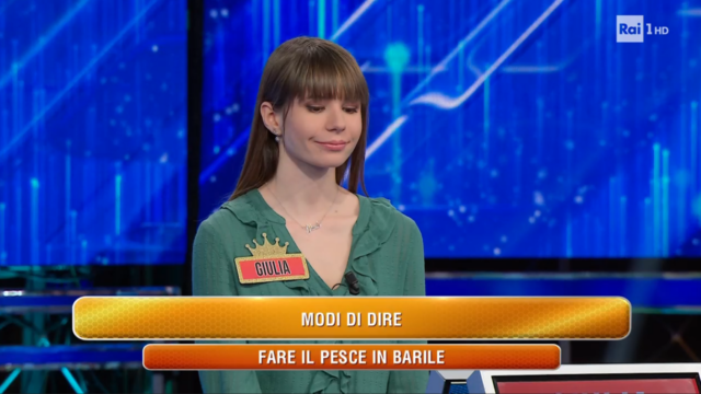 La gara è iniziata con la prima sfida “C’è e non c’è”, con la categoria “Modi di dire” e la concorrente è finita subito in giallo dopo aver risposto “non c’è” al detto “Fare il pesce in barile”.